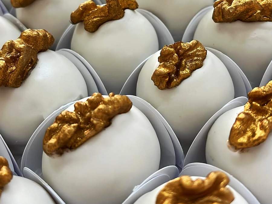 Brigadeiro de nozes, glaceado e decorado com nozes dourada